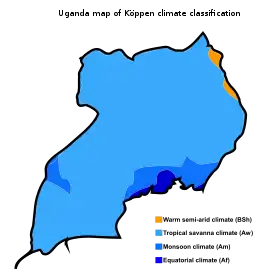 El clima de Uganda es tropical y húmedo en general, modificado por la altitud y localmente por los lagos. Las masas de aire proceden normalmente del nordeste y el sudeste. Al estar en el ecuador, los días duran todo el año doce horas, y la cobertura nubosa hace que haya pocas variaciones, con medias anuales entre 21 y 23.oC y lluvias entre 1.000 y 1.500 mm, con máximos entre abril y mayo, y julio y agosto.[6]