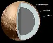 El diámetro del núcleo se cree que es de aproximadamente 1700 km, el 70% del diámetro de Plutón.[16] Es posible que tal calentamiento continúe hoy en día, creando una subsuperficie con un océano de agua líquida y amoniaco desde unos 100 hasta unos 180 km de espesor en la frontera del núcleo–manto.[16][15][17] El DLR calcula que la relación densidad-radio de Plutón se encuentra en una zona de transición, al igual que la luna Tritón de Neptuno, entre los satélites helados (como los satélites medianos de Urano y Saturno) y los satélites rocosos (como Ío de Júpiter).[18]