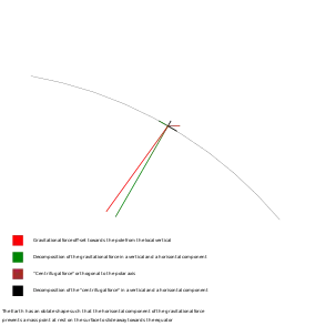Para aplicaciones geofísicas, la gravedad se distingue de la gravitación. La gravedad se define como la resultante de la gravitación y la fuerza centrífuga causada por la rotación de la Tierra. La superficie media del mar global está cerca de una de las superficies equipotenciales del geopotencial de la gravedad . Esta superficie equipotencial, o superficie de geopotencial constante, se llama geoide.[1] En la figura se ilustra cómo la fuerza gravitacional y la fuerza centrífuga se suman a una fuerza ortogonal al geoide (no a escala). En la latitud 50 grados, el desplazamiento entre la fuerza gravitacional (línea roja en la figura) y la vertical local (línea verde en la figura) es de hecho 0.098 grados. Para un punto de masa (atmósfera) en movimiento, la fuerza centrífuga ya no coincide con la gravedad y la suma vectorial no es exactamente ortogonal a la superficie de la Tierra. Esta es la causa del efecto coriolis para el movimiento atmosférico.