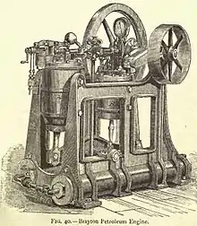 En 1872 George Brayton patentó un motor de combustión interna de presión constante, inicialmente usando gas vaporizado, pero más tarde utilizando combustibles líquidos como el queroseno y el aceite, conocido como motor de Brayton, el motor utiliza un cilindro de compresión, un depósito receptor y un cilindro de potencia/expansor separados en que los productos de combustión se ampliaron para el movimiento de la energía.[2][3] La diferencia significativa de otro pistón impulsado por motores de combustión interna es que los dos cilindros están dispuestos de modo que la mezcla combustible/aire se quema progresivamente a presión constante como se transfiere desde el cilindro del compresor y el depósito en el cilindro de trabajo/expansión. En la versión original una mezcla gas/aire es creada por un carburador de superficie caliente, comprimida y almacenada en un depósito que estaba encendido y luego se introduce en un cilindro de expansión.[4] Una malla metálica se usa para prevenir la combustión corriendo de vuelta al depósito. Sin embargo, a veces el error de malla, conduce a un flash-back o explosión. En 1874 Brayton solicitó una patente para un sistema de inyección de combustible líquido. En esta versión el combustible fue introducido, como en el pasado había sido el aire, dentro del cilindro de expansión eliminando el problema de la explosión.[3] Permaneciendo encendida una llama piloto.El principio se conoce como combustión a presión contante, y había sido intentado sin éxito por Sir William Siemens c.1861 utilizando un motor de 4 cilindros con una cámara de combustión separada. Brayton no sólo logró el éxito en la realización de los trabajos de ciclo de presión constante, sino que también lo fabricó y comercializó como producto.