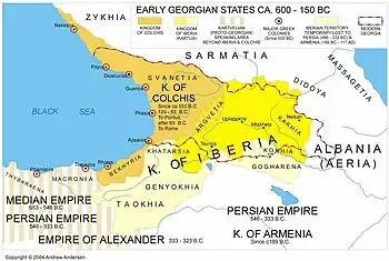 Georgia antes de Roma, con los Reinos de Colchis y de Iberia. Colchis (Cólquida) fue posteriormente la provincia romana de "Lazicum", mientras que Iberia (Iveria) fue un vasallaje romano.