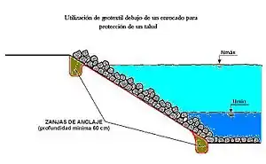 - Refuerzo en la tracción, eliminando las fuerzas de vuelco. Por ejemplo: en muros de contención, por intercalación del geotextil hacia el interior del muro.