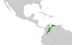 Se la encuentra en Colombia, Trinidad y Tobago, y Venezuela. Sus hábitats naturales son los bosques húmedos montanos tropicales.