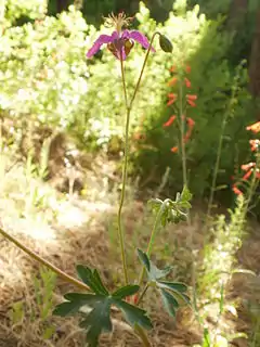 La flor tiene un color púrpura a roja con 5 estambres, y los sépalos acuminados, estrechándose con una perspectiva a largo. Las hojas son palmeado lobuladas. El fruto es un esquizocarpo compuesto por 5 mericarpos. Crece en suelos húmedos, como en el sotobosque de los bosques de coníferas.