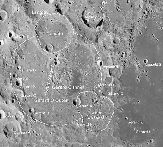 ![]() Imagen de la misión Lunar Orbiter 4 centrada en Gerard. Gerard A es el pequeño cráter de la izquierda. | ||