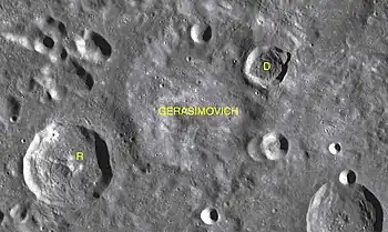 ![]() Imagen LRO WAC, con Gerasimovich en el centro-derecha, Gerasimovich R al centro-izquierda, y Gerasimovich D arriba-derecha sobre el brocal de Gerasimovich | ||