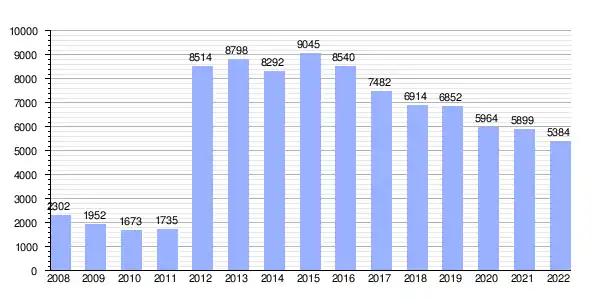 | Gráfica de evolución demográfica de Gibraleón[9] entre 1842 y 2021 |