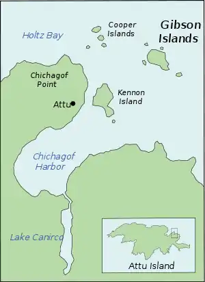 El grupo de las islas Gibson constituye un archipiélago de pequeñas islas que se extiende 0,5 km en la boca de la bahía de Chichagof, en la costa nororiental de Attu Island. Las islas fueron bautizadas así en julio de 1855 durante la North Pacific Surveying Expedition por el teniente William Gibson, comandante de la goleta USS Fenimore Cooper de la US Navy.