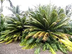 - Familia 2. Zamiaceae Horan., Prim. Lin. Syst. Nat.: 45 (1834). Tipo: Zamia L. Sinónimos: Encephalartaceae Schimp. & Schenk en K.A. Zittel, Handb. Palaeontol., Palaeophyt. 2: 215 (1880). Tipo: Encephalartos Lehm. Stangeriaceae Schimp. & Schenk en K.A. Zittel, Handb. Palaeontol., Palaeophyt.: 216 (1880). Tipo: Stangeria T.Moore. Boweniaceae D.W.Stev., Amer. J. Bot. 68: 1114 (1981). Tipo: Bowenia Hook.f. Dioaceae Doweld, Tent. Syst. Pl. Vasc.: xv. (2001). Tipo: Dioon Lindl. Microcycadaceae Tarbaeva, Anat.-Morf. Str. Sem. Cycad.: 19 (1991). Tipo: Microcycas (Miq.) A.DC.