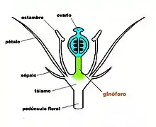 Diagrama de organización de una flor perfecta de planta superior con ginóforo.