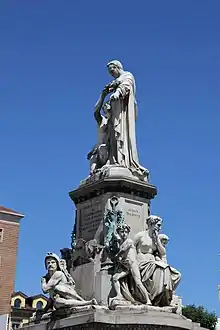 - 1873 - Monumento al conde de Cavour. En 1965 el consejo municipal de Turín aprobó el boceto de esta obra que se inauguró en 1873 con la presencia del rey Víctor Manuel II. La escultura representa al conde Camillo Benso con un papel en la mano donde está escrito: Libera chiesa in libero Stato (iglesia libre en un estado libre) y, a sus pies, una figura femenina que representa a Italia entregándole la corona cívica. Alrededor del pedestal, dos figuras masculinas alegóricas: el Derecho y el Deber; la Independencia; y la Política entre dos partidos, los subversivos y los reaccionarios, representados por dos niños. Los laterales de la parte inferior del monumento están decorados con bajorrelieves: Regreso de las tropas italianas de Crimea y Congreso de París.[35] Está situada en la plaza Carlo Emanuele II (o plaza Carlina) en Turín.[36][37]