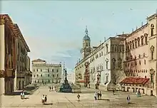 En 1306 se disputaban el gobierno de la ciudad las familias de los Geremei y los Lambertazzi, güelfos y gibelinos respectivamente, y cuando el cardenal Napoleone Orsini intentó pacificarlos fue expulsado; el año siguiente la población boloñesa estaba dividida entre los Maltraversi (seguidores de los Gozzadini) y los Scacchesi (partidarios de los Pepoli)[lower-alpha 4] y de entre estos últimos surgió como signore el banquero Romeo Pepoli, que en 1321 fue expulsado por la población; en 1327 asumió el poder el cardenal Bertrand du Pouget, nepote de Juan XXII; en 1337 fue también expulsado y su lugar ocupado por Taddeo Pepoli, que enemistado con Benedicto XII murió durante la peste negra que acabó con la vida de cerca de un tercio de la población; en 1350 sus hijos Giacomo y Giovanni Pepoli vendieron la ciudad a la Casa de Visconti, por aquel entonces señores de Milán, a la que pertenecía Giovanni Visconti da Oleggio que en 1355 se autoproclamó signore; en 1360 el cardenal Gil de Albornoz la recuperó para la Santa Sede; en 1376, durante la Guerra de los Ocho Santos promovida por la República de Florencia, una revuelta popular expulsó al legado pontificio Guillaume Noellet e instauró un gobierno comunal; dos años después Giovanni da Legnano quedó como vicario en nombre de Gregorio XI y tras su muerte le sucedió el cardenal Filippo Carafa della Serra, con los Estados Pontificios ya inmersos en el Cisma de Occidente.[6]