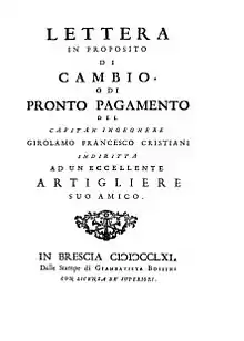- Lettera in proposito di cambio, o di pronto pagamento. Brescia: Giambattista Bossini. 1761.