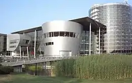 Vista de la entrada de visitantes y la cafetería (a la derecha)