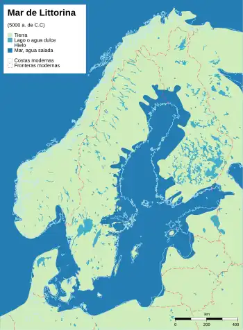 El ajuste isostático debido a la deglaciación se refleja en los cambios en la costa del mar Báltico y otros cuerpos de agua cercanos. [alfa superior 3] En el mar Báltico, la elevación fue mayor en la Costa Alta en el oeste del mar de Botnia. Dentro de la Costa Alta, la costa relicta que llega a 286 m en Skuleberget es actualmente el punto más alto conocido en la Tierra que haya resultado elevado por el ajuste isostático postglacial.[13] Al norte de la Costa Alta en Furuögrund, frente a la costa de Skellefteå, se encuentra el área con la tasa de elevación mayor en la actualidad con valores de aproximadamente 9 mm/año[14][15] Se cree que el ajuste posglacial en curso dio como resultado la división del Golfo de Botnia en un golfo sur y un lago norte a través de Norra Kvarken, no antes de aproximadamente 2.000 años.[16] El ajuste isostático expuso un paisaje submarino de valle de fractura como el archipiélago de Estocolmo.[17][18]