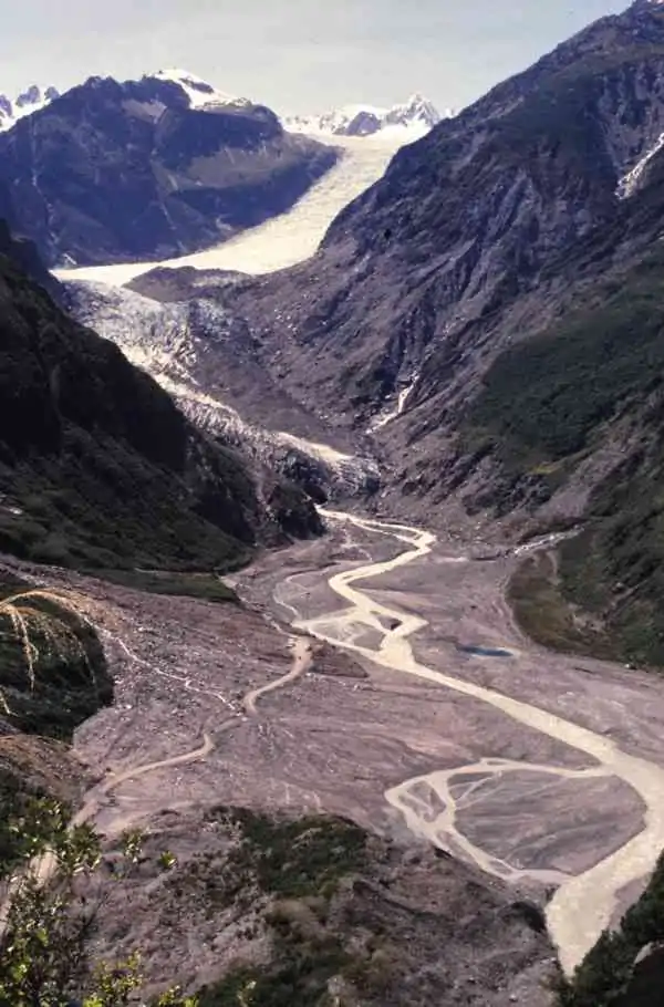 Alimentado por cuatro glaciares alpinos, el glaciar Fox desciende 2.600 m en su recorrido de 13 km desde los Alpes del Sur hacia la costa, terminando cerca de la selva tropical a 300 metros sobre el nivel del mar. Tras retroceder durante la mayor parte de los 100 años anteriores, avanzó entre 1985 y 2009. En 2006, el ritmo medio de avance era de aproximadamente un metro a la semana.[10] En enero de 2009, la cara terminal del glaciar seguía avanzando y sus caras verticales o salientes se derrumbaban con regularidad.[11] Desde entonces se ha producido un retroceso significativo, con el nivel máximo de 2009 claramente visible como línea de vegetación en la ladera sur sobre lo que queda del glaciar inferior en la actualidad.[12]
