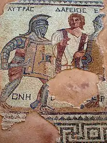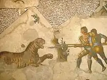 En los intermedios entre combates salían a la arena los paegnarii, bufones y animadores que realizaba duelos incruentos durante las pausas para entretener a la multitud mientras los gladiadores descansaban; luchaban con látigo, palos o armas de madera y no tenían casco ni escudo, solo envolturas protectoras en la parte inferior de las piernas y la cabeza. En las pausas también podían actuar acróbatas, saltimbanquis y otros artistas.[149][150] Ludi y munera iban acompañados de música, interpretada en interludios, para marcar las distintas partes del munus o creando un «crescendo frenético» durante los combates y acentuando las fases más críticas;[151] los golpes podían ir acompañados de toques de trompeta.[117][152] El mosaico de Zliten en Libia nos muestra a músicos tocando un acompañamiento de juegos provinciales, con gladiadores, bestiarii o venatores y prisioneros atacados por bestias. Sus instrumentos son una trompeta larga y recta (tubicen), un gran cuerno curvo (cornu) y un órgano hidráulico (hydraulis).[153] Representaciones similares (músicos, gladiadores y bestiari) se encuentran en un relieve de una tumba en Pompeya.[154]