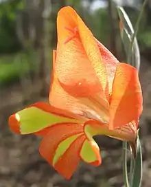 Gladiolus: nombre genérico que se atribuye a Plinio y hace referencia, por un lado, a la forma de las hojas de estas plantas, similares a la espada romana denominada "gladius". Por otro lado, también se refiere al hecho de que en la época de los romanos la flor del gladiolo se entregaba a los gladiadores que triunfaban en la batalla; por eso, la flor es el símbolo de la victoria.[4][5]