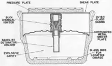 La mina consistía en un tazón de vidrio de 6 pulgadas (15,2 cm) de diámetro que contenía la carga explosiva y un detonador. La parte superior de la mina estaba cubierta por un disco de lámina de vidrio de 0,25 pulgadas (6,4 mm) de espesor, debajo de una placa de presión de vidrio moldeada gruesa. Cada mina recibió una pequeña cantidad de masilla de cemento para sellar los espacios entre el cuerpo principal y la cubierta del disco de vidrio y hacer que la mina fuera resistente al agua.[2]