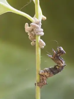 ![]() Una oruga de la polilla geométrida, Thyrinteina leucocerae, con pupas de la avispa parasitoide bracónida Glyptapanteles sp. | ||