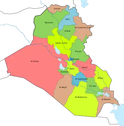 La organización territorial de Irak se constituye en gobernaciones (árabe: محافظة muḥāfaẓah, pl. محافظات muḥāfaẓāt), también llamadas provincias, son las circunscripciones administrativas mayores en las cuales se divide el país. Desde el 2005, Irak es una república federal, reservando el derecho a las provincias de conformar regiones autónomas según las condiciones establecidas en la constitución.[1] Cuatro gobernaciones, Erbil, Solimania, Duhok y Halabja, constituyen la Región autónoma del Kurdistán. Las gobernaciones de Bagdad (que es la más poblada) y de Basora son las provincias más antiguas de Irak. La segunda provincia más poblada, Nínive se encuentra en las tierras altas y en un clima bastante fresco del noroeste.