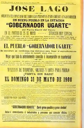 El pueblo de Gobernador Ugarte fue fundado el domingo 31 de mayo de 1908 a partir del remate de los terrenos que forman el pueblo por parte de José Lago. Su estación ferroviaria se encuentra en el km 190,5 del FFCC Sarmiento (tomando a Once como km "0"), sobre el ramal Gorostiaga - Anderson. El aviso rezaba: