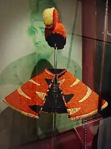 El mahiole (casco) y ʻAhu ʻula (capa o capote) eran el derecho de sólo los jefes de más alto rango.[9] Fueron creados usando intrincadas artesanías de plumas en diseños para representar la divinidad de los jefes así como su poder.[10] Un solo ʻahu ʻula necesitaba miles de pájaros para suministrar plumas.[11] Las insignias se usaban sólo durante la batalla o actos ceremoniales.[12][13]