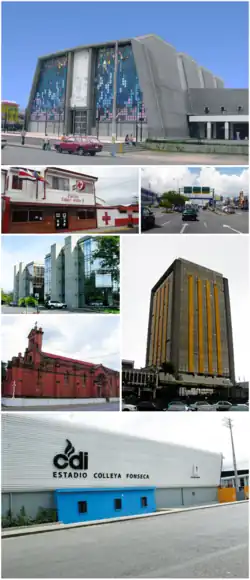 ![]() De arriba abajo, de izquierda a derecha: Parroquia Nuestra Señora de Guadalupe, Cruz Roja de Guadalupe, vista de la carretera de Circunvalación, Oficentro Torres del Campo, Edificio de RECOPE Iglesia de San Francisco de Asís, Estadio José Joaquín "Coyella" Fonseca.