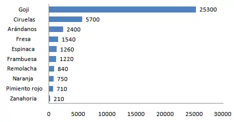 En la siguiente tabla se muestra la C.A.R.O., capacidad de absorción de radicales de oxígeno, (en inglés: ORAC), es un método de medición de la capacidad antioxidante en muestras biológicas in vitro, si bien resulta un tanto controvertido para la comunidad científica.[cita requerida]