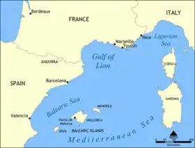 | Ciudades ribereñas | Marsella, Toulon, Sète, Argelès-sur-Mer, Six-Fours-les-Plages | |
