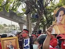 El golpe de Estado en Birmania de 2021 comenzó la mañana del 1 de febrero cuando los miembros elegidos democráticamente del partido gobernante de Birmania, que es la Liga Nacional para la Democracia, en el gobierno civil fueron depuestos por el ejército de Birmania, que otorgó el poder a una estratocracia. El Tatmadaw declaró el estado de emergencia durante un año y declaró que el poder había recaído en el comandante en jefe de las fuerzas armadas, Min Aung Hlaing. El golpe de Estado ocurrió el día antes de que el Parlamento de Birmania jurara a los miembros electos en las elecciones generales de noviembre de 2020, evitando que esto ocurriera.[1][2][3] El presidente Win Myint y la consejera de Estado Aung San Suu Kyi fueron detenidos, junto con los ministros y sus diputados y miembros del Parlamento.[4][5]