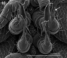 | Siphonophorida | 2 | 9.º y 10.º | Similar a las patas; PP9 transferencia de esperma | ![]() Illacme plenipes, la fecha apunta a los gonópodos anteriores |