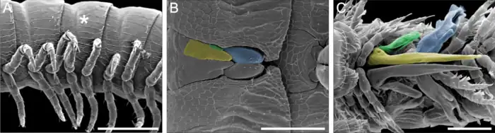 | Glomerida | 2 (telópodos) | No está relacionado con la transferencia de esperma, solo utilizado para sujetas a las hembras | ![]() Glomeris troglokabyliana patas marchadoras (A, B) y telópodo (C) | |