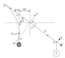 donde L es la distancia desde O hasta B y d(β) es la distancia, entre el origen y la recta tangente a la directriz en el punto T, recta que viene físicamente realizada por el hilo, del que pende el contrapeso Q. El hecho de que el peso P haya de ser proporcional a β, que es el objetivo del goniobarímetro, transforma (1) en la ecuación: