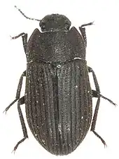 Pose cuerpo ovalado, ligeramente aplanado.[2] Mide aproximadamente 8 milímetros de longitud y 3 milímetros de ancho.[2] Es de color castaño, con una piel dura y brillante.[2]