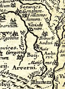 (Traducción: 'Con esto en la mente, Vercingétorix guio a su ejército de vuelta al territorio de los bituriges y avanzó desde allí hacia Gorgóbina, el oppidum de los boyos - a quienes, derrotados en la batalla de los helvecios, César había instalado allí y asignados a los heduos -, y la asedió.')