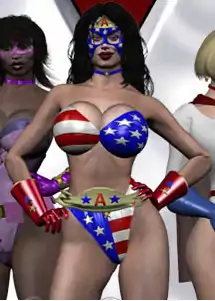• Posibilidad lésbica: por contra, en un momento dado, Ms. Americana se acerca para examinar uno de sus pechos recién ordeñado por una inseminoide y Got-Gal la pide que siga masajeándola mientras la reconoce haber admirado siempre sus atributos.[38] Sin embargo, en ningún momento mantiene una escena lésbica con otra heroína, como si las tiene Sara Kraft con Jungle Babe o Ms. Americana con Omega Woman, en este último caso la primera con las facultades mentales disminuidas. Ambigüedad esta poco usual, como se ha dicho, en los relatos gráficos estadounidenses.[106] Más aún en el caso de las lesbianas, quienes no pierden tiempo y mantienen relaciones sexuales con mujeres casi desconocidas a la primera ocasión, nuevamente al revés de lo demostrado por la vida real,[107] sería el caso de Hexiss,[108] de Dolly[109] o de Susan con Lady Ardor.[93] Por contra, Got-Gal no muestra ningún interés sexual por sus compañeras, ni se aprovecha de su adlátere, incluso estando en la privacidad del domicilio,[110] como sí hacen la citada Hexiss Hellfawn.[108]