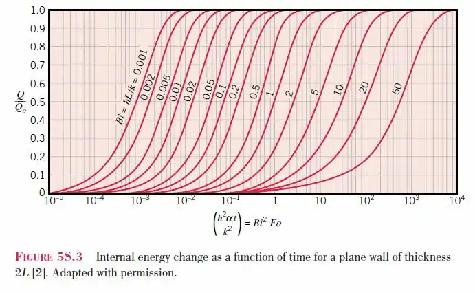 El primer gráfico para la pared plana se traza utilizando tres variables diferentes. Trazado a lo largo del eje vertical del gráfico se encuentra la temperatura adimensional en el plano medio, Trazado a lo largo del eje horizontal está el número de Fourier, Fo = αt/L2. Las curvas dentro del gráfico son una selección de valores para el inverso del número de Biot, donde Bi = hL/k. k es la conductividad térmica del material y h es el coeficiente de transferencia de calor".[2]