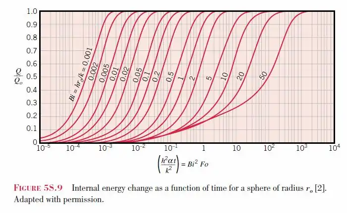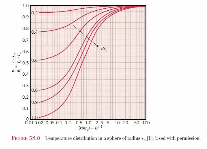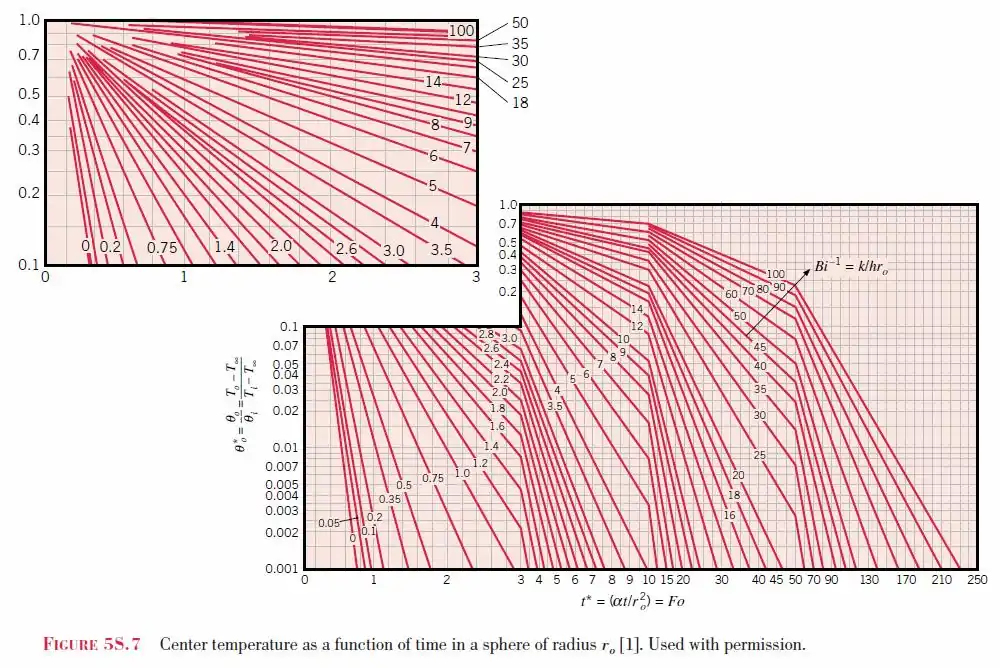 El gráfico de Heisler para una esfera se basa en el primer término en la solución exacta de la serie de Fourier:[2]