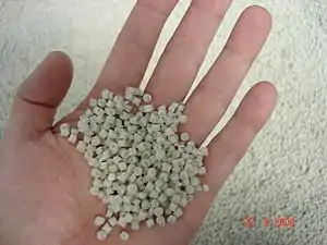 En polímeros se utilizan granulos de polímero, gránulos de concentrado de color y de aditivos para la fabricación de perfiles o piezas moldeadas por inyección o extrusión, rotomoldeo, etc.