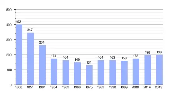 Los datos demográficos contemplados en este gráfico de la comuna de Grèzes[4] se han cogido de 1800 a 1999 de la página francesa EHESS/Cassini, y los demás datos de la página del INSEE.[5]