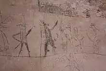 Algunos de los grafitis realizados en este sitio durante la época novohispana fueron realizados con la ayuda de objetos punzocortantes, los cuales recrean desde fiestas rituales, como lo es el corpus Christi, caballos, toreros, palos, voladores, castillos pirotécnicos, procesiones de santos y vírgenes, hasta temas como ejecuciones a causa de brujería. Sin embargo también se encuentran dentro de sus representaciones a soldados españoles, seres fantásticos, entre otros.[9]