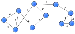Formalmente, un grafo ponderado se puede definir como un trío ordenado , donde es su conjunto de vértices, es su conjunto de aristas, y es el conjunto de pesos asociados a cada arista.[1] Asimismo, se puede representar también como una función de asignación de pesos , de modo que para cualquier arista , su peso es . Dado que cualquier conjunto finito de valores se puede asociar a un subconjunto de los números reales, las aristas también admiten solo números enteros, o bien valores no numéricos, tales como letras o colores. En redes sociales, es común restringirse a números naturales.[1]