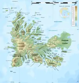 El litoral de Gran Tierra es fuertemente recortado y forma numerosas penínsulas Las principales son, en relación con el glaciar Cook: