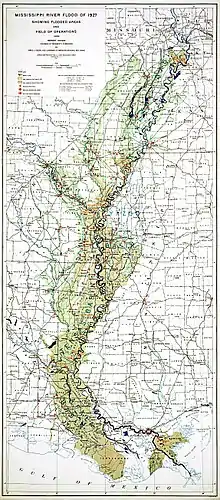 La gran inundación del Misisipi de 1927 fue la inundación por desborde de río más destructiva en la historia de los Estados Unidos, con 27 mil kilómetros cuadrados inundados hasta una profundidad de 10 metros. Para evitar futuras inundaciones, el gobierno federal construyó el sistema más largo del mundo de diques y cauces de alivio. Muchos afroamericanos desplazados de sus hogares a lo largo de la parte baja del río Misisipi se unieron a la Gran Migración hacia las ciudades industriales del norte y del Medio Oeste.