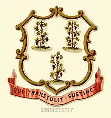 El lema actual parece un poco diferente de la 1639 la versión (CFsustinet qui transtulit). Fue visto por primera vez en las colonias en 1639 en un sello traído de Inglaterra por el Coronel George Fenwick. El significado del lema se explica en 23 de abril de 1775 en una carta sellada en Wethersfield, Connecticut: "Fijamos en nuestras normas y Tambores de la Colonia de armas, con el lema, Qui Transtulit sustinet, redondo en letras de oro, que interpretamos de esta manera: Dios, que nos trasplantados acá, nos apoye ".
