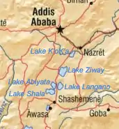 - Lago Shala (329 km², elevación 1558 m), el lago etíope del Valle de Rift más profundo