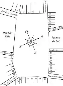 Situación de las casas de la Grand-Place 1 : Le Roi d’Espagne (el Rey de España); 2 - 3 : La Brouette (la carretilla); 4 : Le Sac (el saco); 5 : La Louve (la loba); 6 : Le Cornet (el cornete); 7 : Le Renard (el zorro); 8 : L’Etoile (la estrella); 9 : Le Cygne (el cisne); 10 : L’Arbre d’Or (al árbol dorado); 11 : La Rose (la rosa); 12 : Le Mont Thabor (el Monte Tabor); 12a : Alsemberg; 13 : La Renommée (la renombrada); 14 : L’Ermitage (la ermita); 15 : La Fortune (la fortuna); 16 : Le Moulin à Vent (el molino de viento); 17 : Le Pot d’Etain (el bote de estaño); 18 : La Colline (la colina); 19 : La Bourse (la Bolsa); 20 : Le Cerf (el ciervo); 21 : Joseph; 22 : Anne; 23 : L’Ange (el ángel); 24 - 25 : La Chaloupe d’Or (la chalupa de oro); 26 - 27 : Le Pigeon (la paloma); 28 : Le Marchand d’Or (el comerciante de oro); 34 : Le Heaume (el yelmo); 35 : Le Paon (el pavo real); 36 : Le Petit Renard (ou le Samaritain) (el zorrito o el samaritano); 37 : Le Chêne (el roble); 38 : Sainte-Barbe (Santa Bárbara); 39 : L’Âne (el asno);