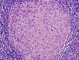 ![]() Imagen microscópica de un granuloma (sin necrosis) en ganglio linfático. H-E. | ||