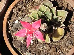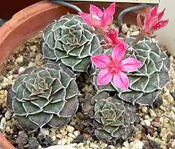 Es una aglutinación de rosetas suculentas con flores de color rosa a rojo en la parte superior de la inflorescencia ramificada de 10 cm de altura. Las flores duran varias semanas, están en posición vertical y en forma de estrella. Resiste temperaturas de hasta -4 °C.